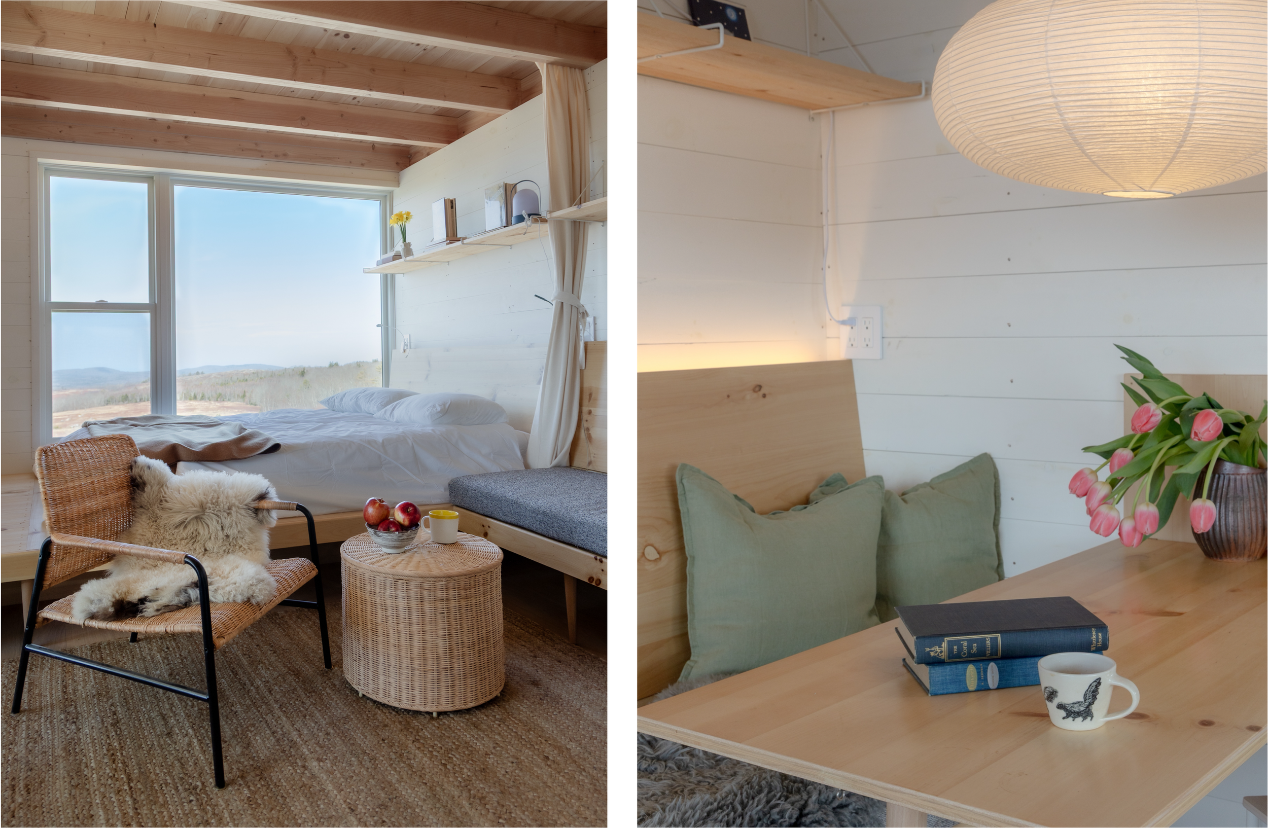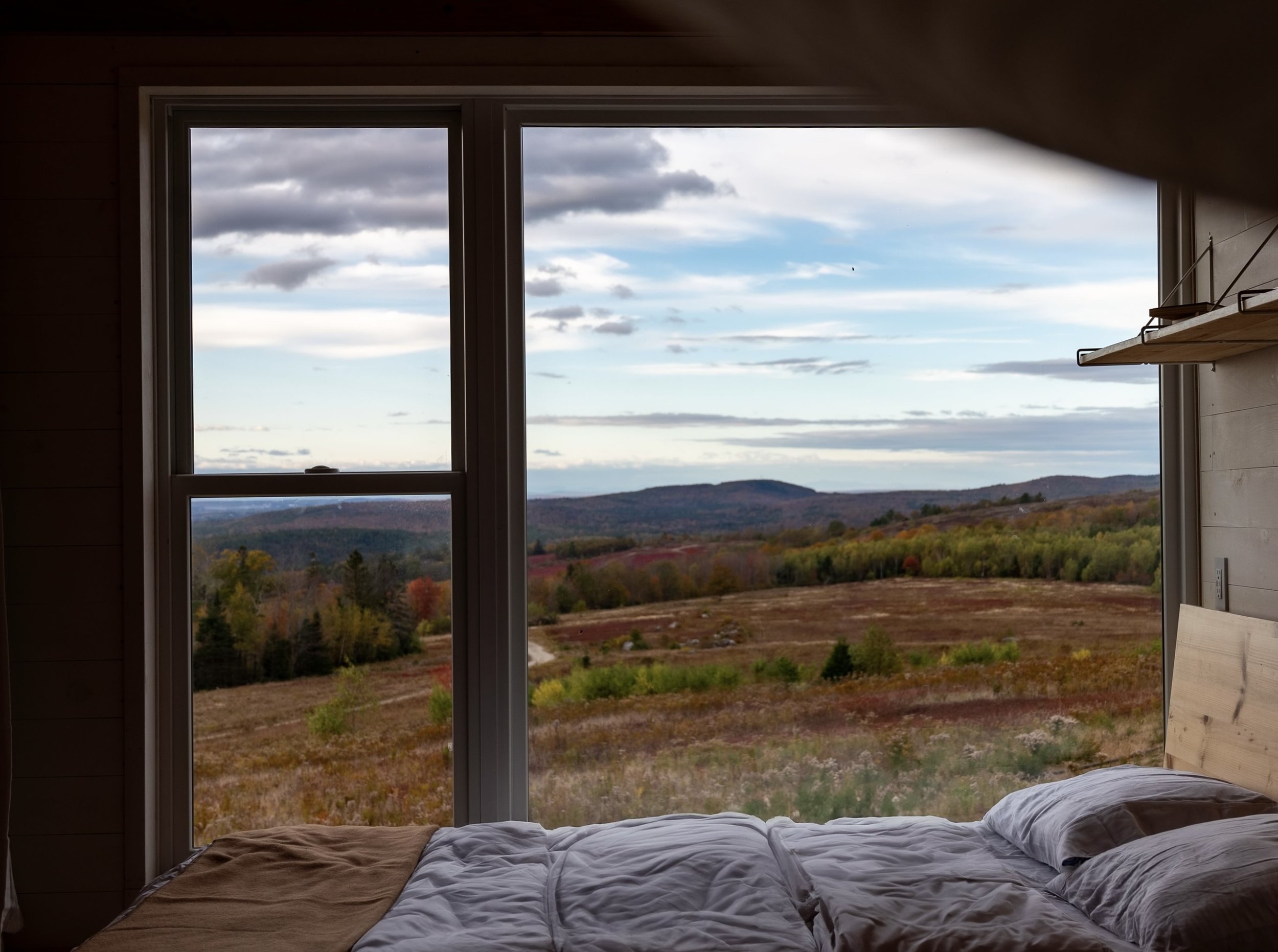 Inside, the eye is drawn immediately to the big window by the queen bed; good for stargazing and daytime gazing, too. Views extend over the wild blueberry bushes carpeting the lower meadow to the blue-green hillsides beyond. On a clear day, you can see Penobscot Bay to the South, and Mt. Katahdin to the north, though you might need to step outside for these. Katahdin stays snow-capped well into Spring and is easy to mistake for a cloud.